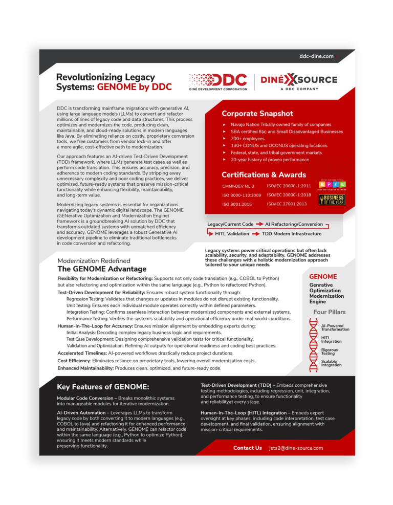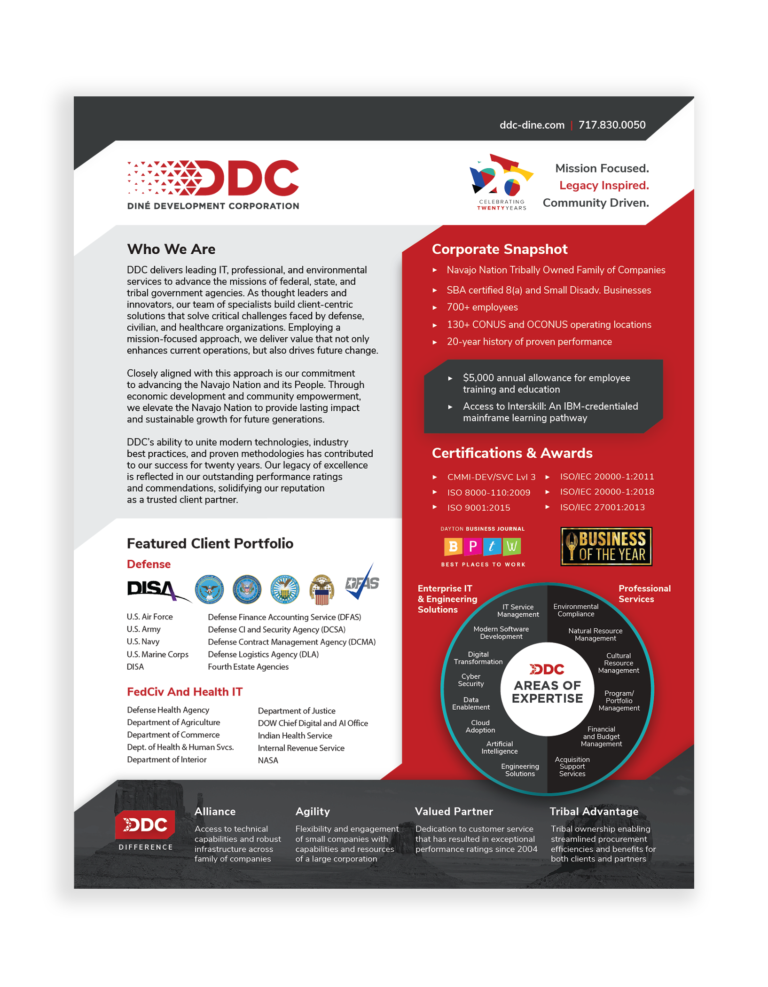 DDC harnesses the Navajo legacy of innovation to power the missions of defense and federal civilian agencies. Leading with our heritage-inspired capabilities model, DDC delivers exceptional value through cutting-edge, reliable, and secure technology solutions. With expertise in mainframe infrastructure, cloud technologies, and distributed computing, we have been a trusted mainframe partner since 2008 in support of mission-critical operations.