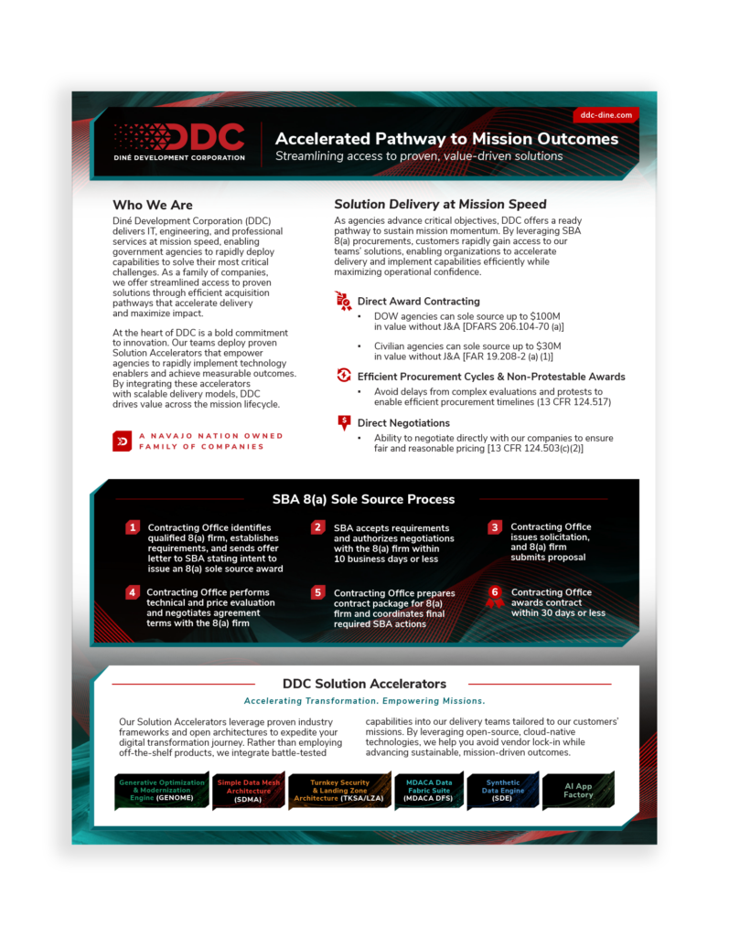 Through Tribal contracting advantages, agencies can directly award contracts to DDC, bypassing lengthy competition cycles while maintaining full compliance with federal procurement regulations. This approach accelerates access to secure, mission-ready AI solutions, ensuring agencies can innovate without delay.